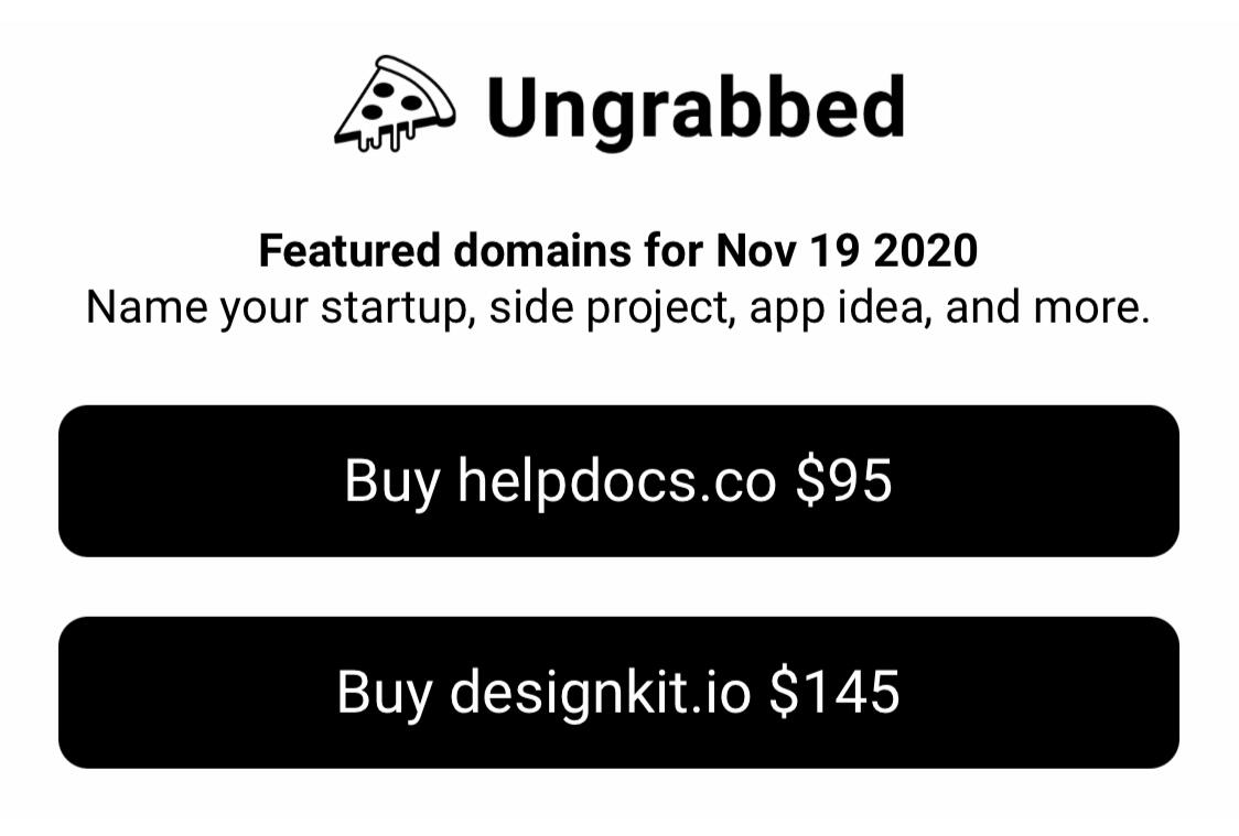 "@ungrabbed sends out domains that people can use to name their startups and side projects that don't cost crazy $$$"
